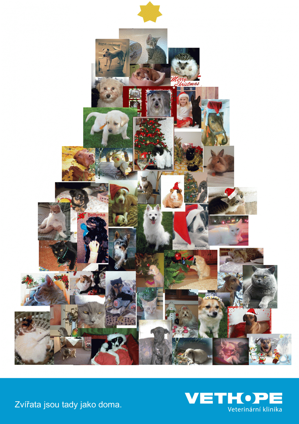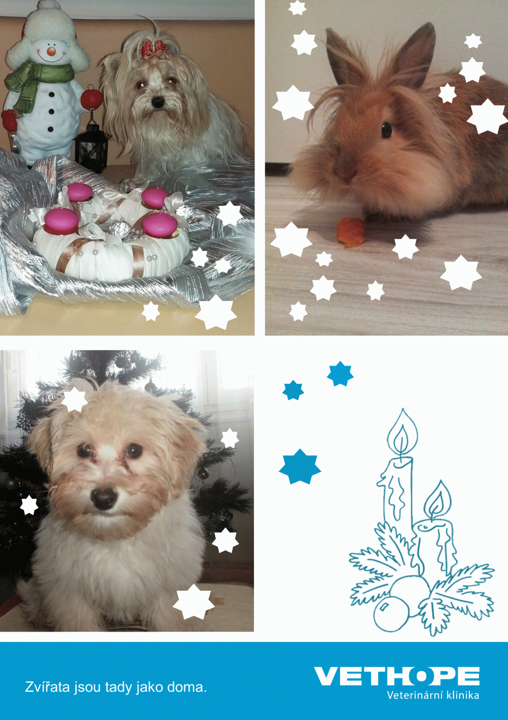 Ve veterinární klinice Vethope v Praze 4 jsou domácí mazlíčci na prvním místě. Chtěli jsme je proto mít i na našem vánočním přání pro rok 2015. Vyhlásili jsme soutěž o nejlepší fotografie domácích zvířecích mazlíčků s vánoční tématikou. Do soutěže se nám přihlásilo 48 účastníků. Z nich návštěvníci našich webových stránek www.vethope.cz vybrali tři, kterým dali nejvíce hlasů.